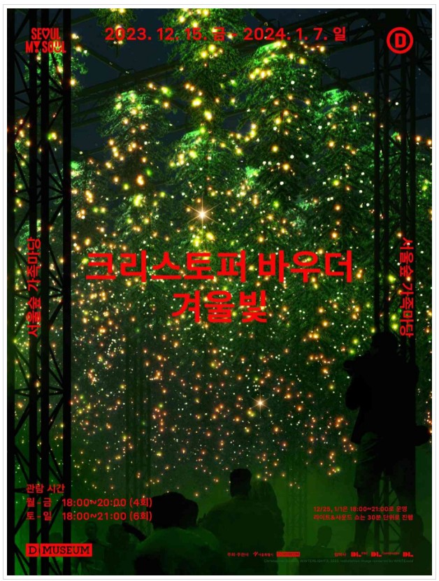 대림문화재단과 서울시가 함께 주최하는 공공예술 프로젝트로, 크리스토퍼 바우더의 라이트와 사운드 설치 전시인 <CHRISTOPHER BAUDER : WINTERLIGHTS>를 아시아 최초로 공개합니다. 서울숲 가족마당에서 진행되는 이번 전시는 '겨울빛, 윈터라이트'라는 주제로 진행되며, 거꾸로 매달린 200여 개의 크리스마스트리와 8만여 개의 조명이 어우러져 있으며, 조명에 반응하는 사운드 쇼까지 더해 신비로움을 자아내는 환상적인 라이트&사운드 전시입니다. 전시 기간은 2023년 12월 15일부터 2024년 1월 7일까지입니다. 평일은 오후 6시부터 8시까지, 주말과 공휴일은 저녁 6시부터 오후 9시까지 회당 30분 간격으로 사전 예매 후 관람이 가능합니다. 관름은 기상악화 등에 따라서 중단, 변경될 수 있습니다. 예약시간 10분 전부터 10분 후까지 입장 가능하며, 예약과 입장은 선착순으로 마감됩니다. 입장 시 예매 내역을 확인하고 있으니, 시간제한이 있는 관람 특성상 미리 티켓을 준비해 주시면 원활한 입장이 가능합니다. 관람 시간은 30분이며 예약한 회차만 입장이 가능하고 한 번 퇴장 후에 재입장은 불가하니 어린이와 함께 가시는 경우 미리 화장실을 이용하신 후 관람을 시작하면 좋습니다. 현장 예약도 가능하나 표가 없을 수 있으니 미리 예약하고 방문하시기를 추천드립니다. 대림미술관 디뮤지엄의 웹사이트와 앱을 통한 사전 예매 시 무료입장 가능합니다. 트리 200여 점이 설치되어 있는 전시회로, 관람 환경을 위해 물을 포함한 모든 음료수와 음식물의 반입이 금지됩니다. 서울숲 가족마당은 지하철 수인분당선 서울숲 역 4번 출구에서 도보 9분 거리에 있습니다.